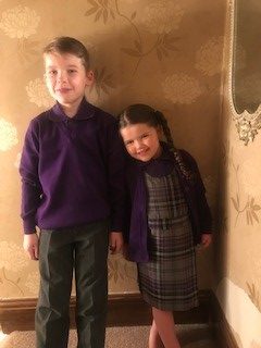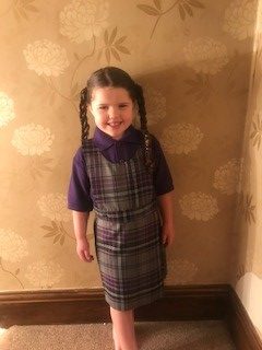 - School purple and grey tartan dress/ skirt OR grey school type, skirt, dress, trousers or shorts